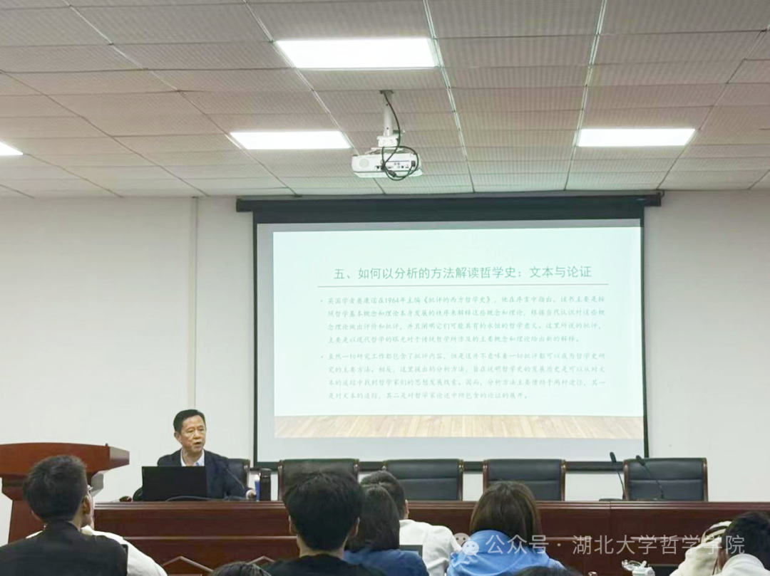 讲座伊始,江老师谈到以分析的方法来揭示西方哲学发展的历史,通过对哲学家论述的文本分析给出哲学家思想的精神面貌。这种分析的方式依据历史文本,借助分析的逻辑和证据,力图揭示哲学家思想的真实面目,借助对文本的分析说明哲学家观点是如何展开论证的。